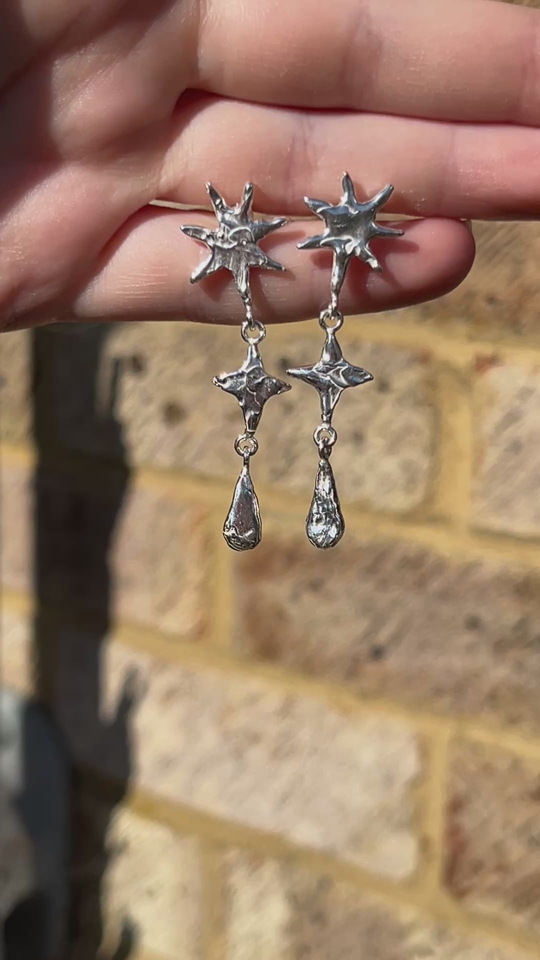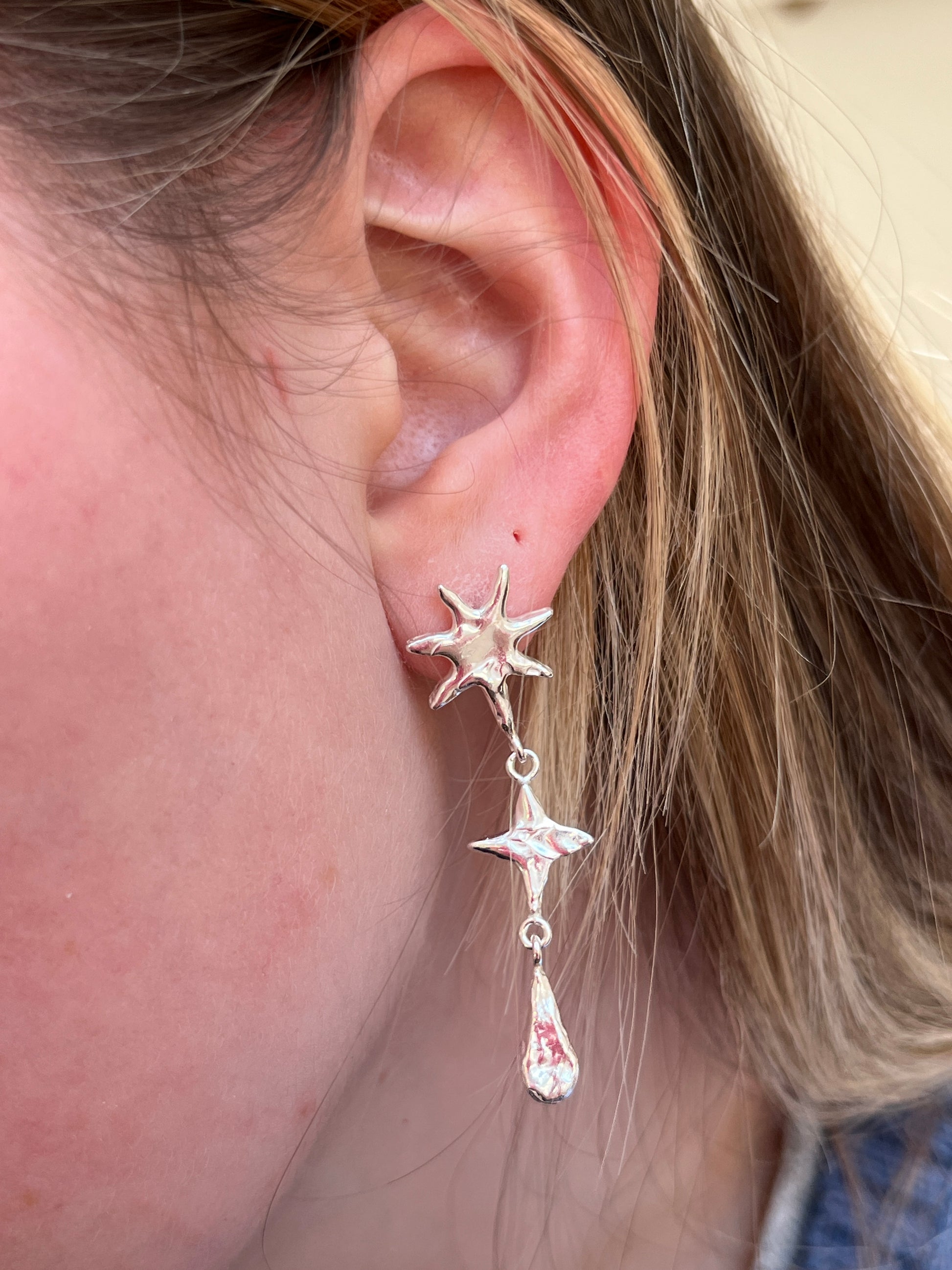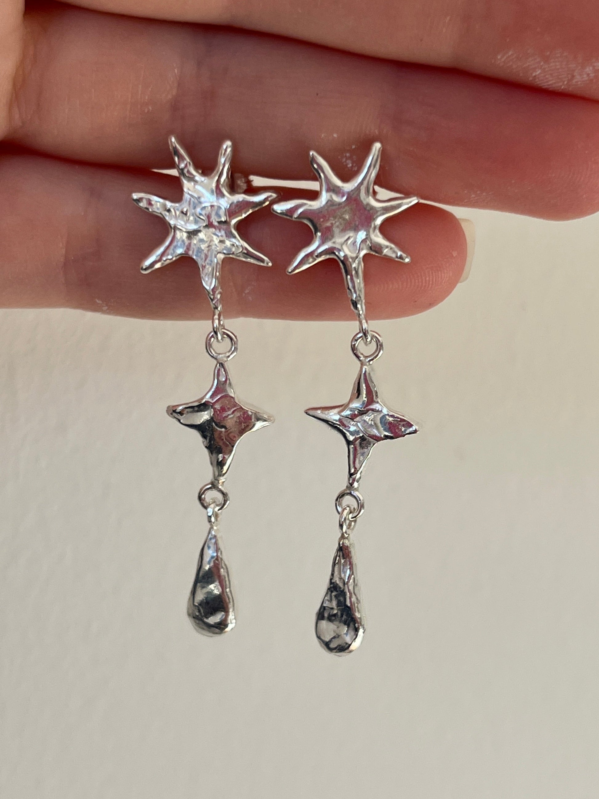 Handcrafted with jewellers wax with the signature molten texture and cast into recycled sterling silver. The drops are 4.5cm from earring post to the bottom of the final drop.