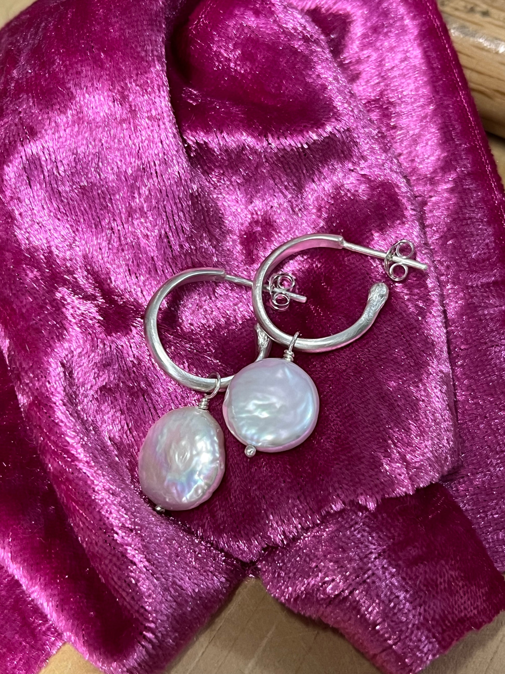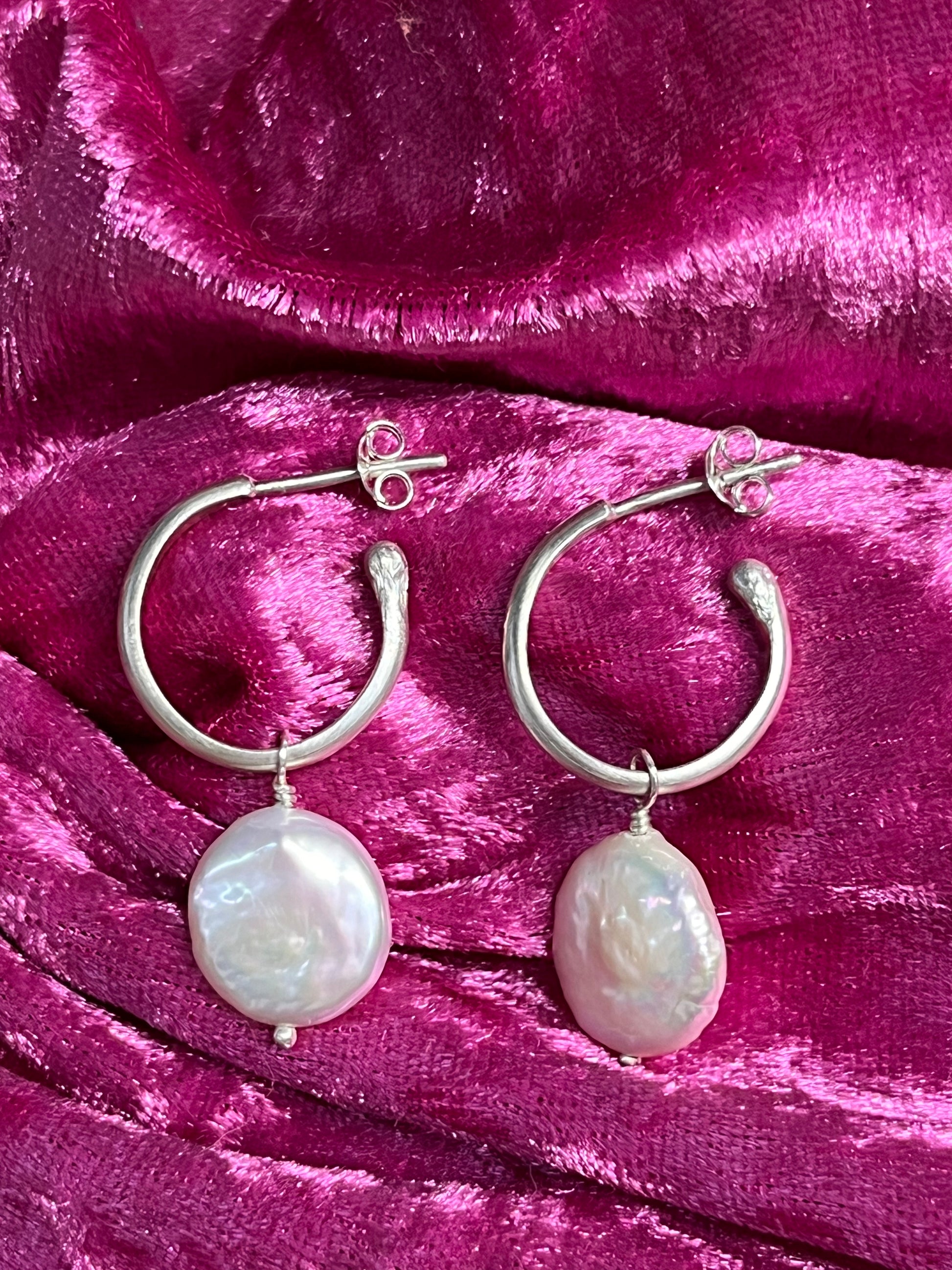 Handcrafted sterling silver hoops paired with freshwater coin pearls. These pearls are great because their shape and lustre perfectly resemble the fullest moon! The satin finish of the hoops playfully mimics moonlight.