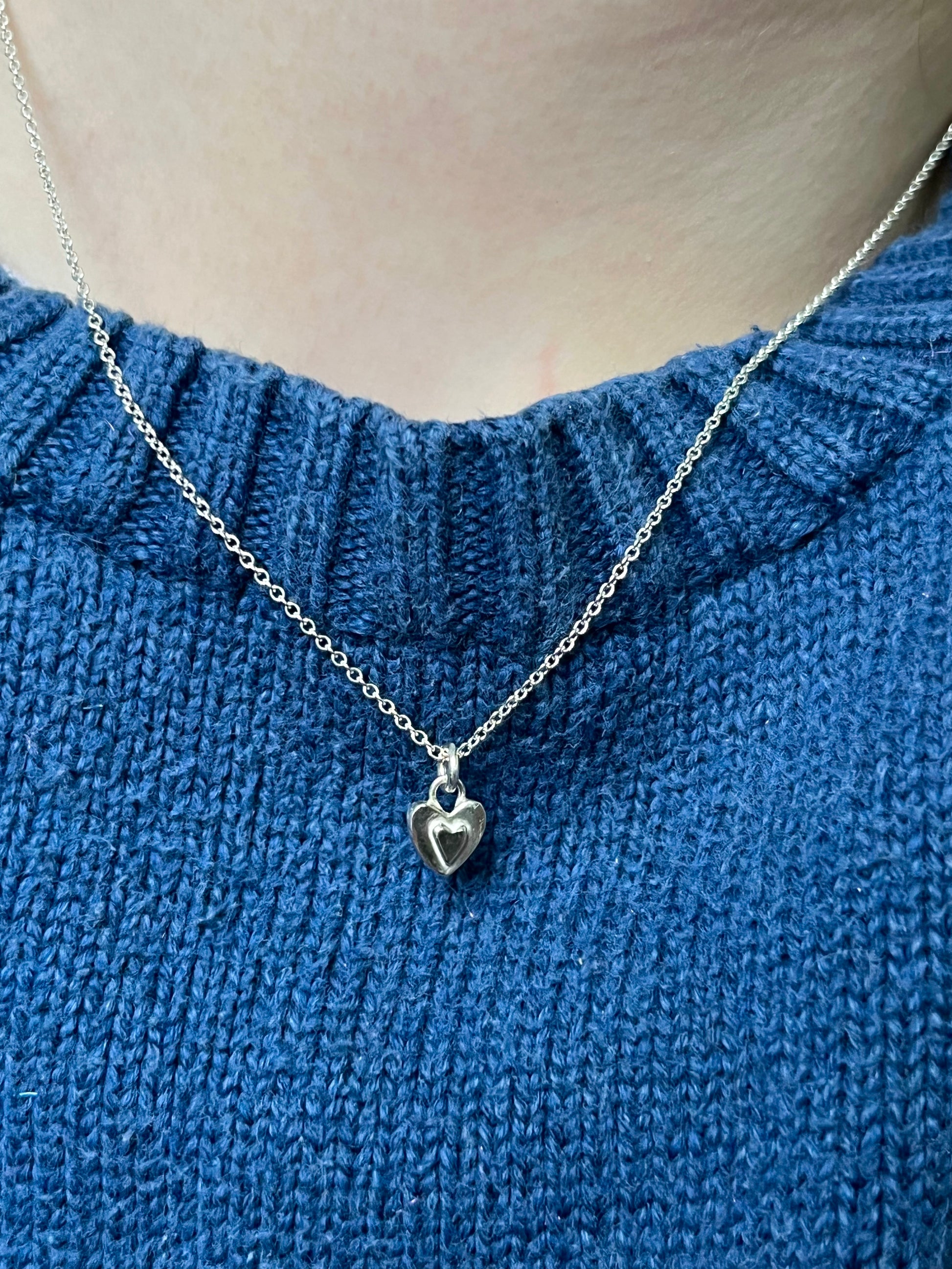 This dainty heart necklace is such a cute addition to any stack. Made from sterling silver from other projects, it is an entirely recycled pendant! Available on a 16-18inch extendable sterling silver chain.